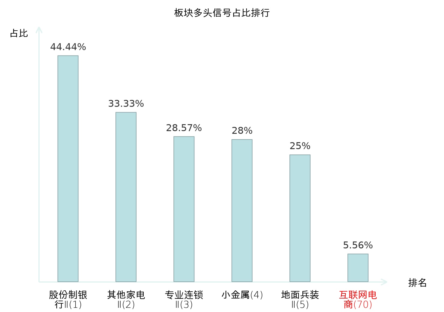 全市场所有行业板块中主力多头信号占比排名中,股份制银行Ⅱ板块位居第一。其他家电Ⅱ板块名次提升最快,较昨日上升127位。