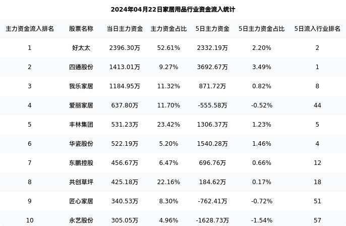 从主力资金流向来看,家居用品行业今日主力资金流入6.63亿元,在所有申万二级行业中排名:65/131。