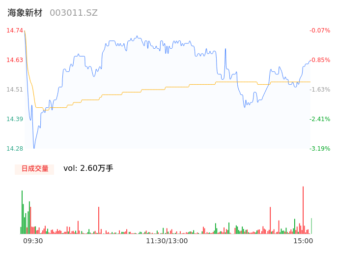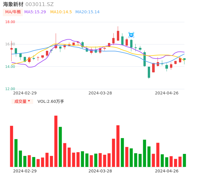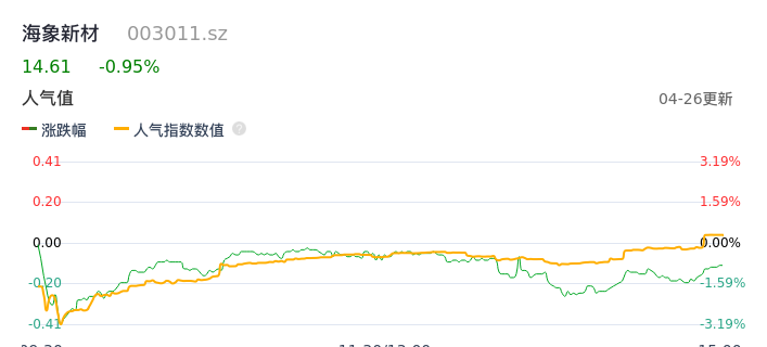 04月26日,海象新材收报14.61,股价涨幅-0.95%,成交金额3778.52万元,换手率3.39%。