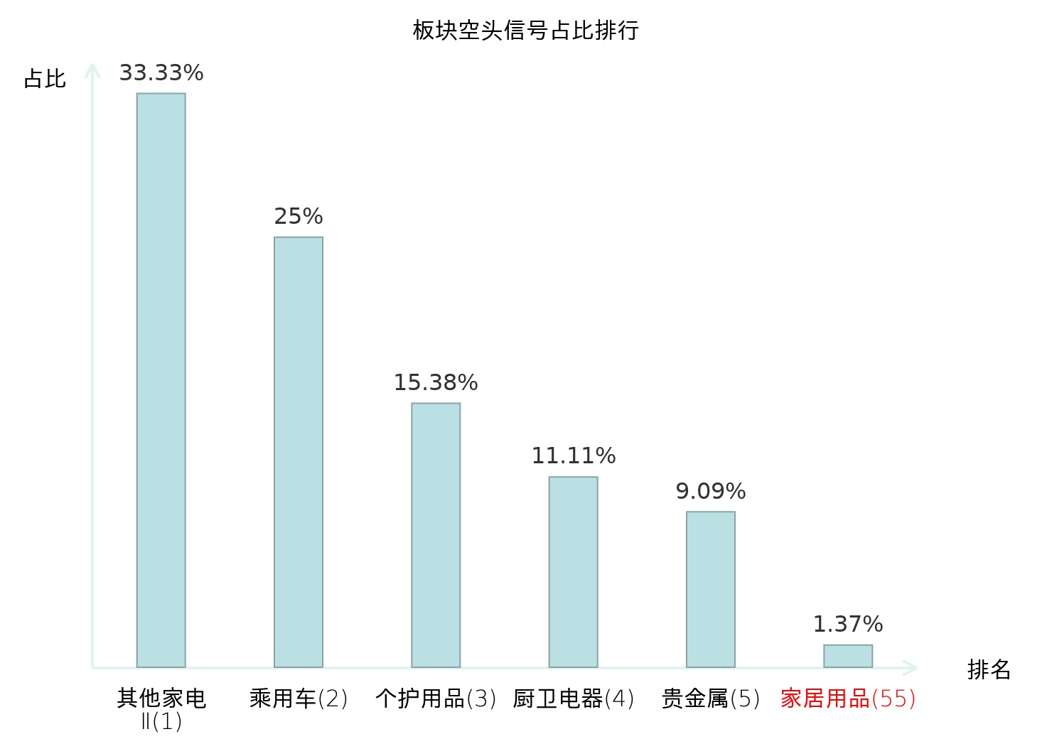 全市场所有行业板块中主力空头信号占比排名中,其他家电Ⅱ板块位居第一。个护用品板块名次提升最快,较昨日上升119位。