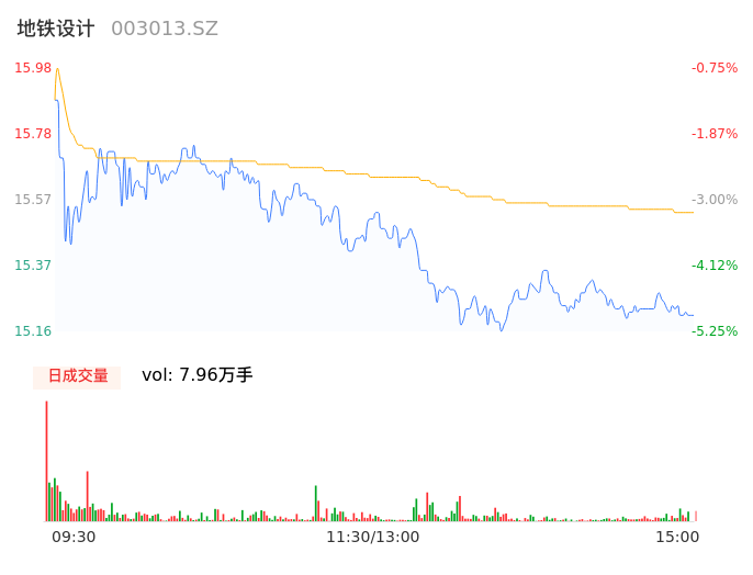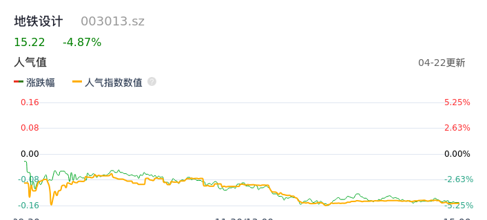 04月22日,地铁设计收报15.22,股价涨幅-4.87%,成交金额1.24亿元,换手率1.99%。