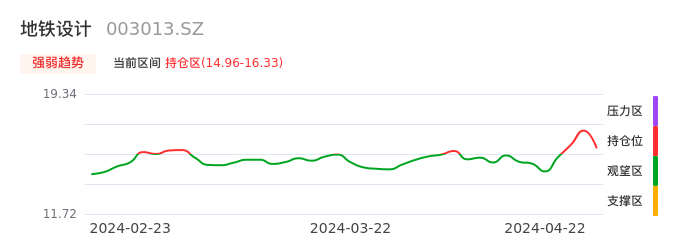 我们来看一下该股的九方特色指标强弱趋势的情况:地铁设计近日从观望区上穿到持仓区。股价短期站上多头区域,但还未完全站稳。后续重点关注多空分界点的争夺:14.96元。如未能有效站稳则可能重新回到空头行情。