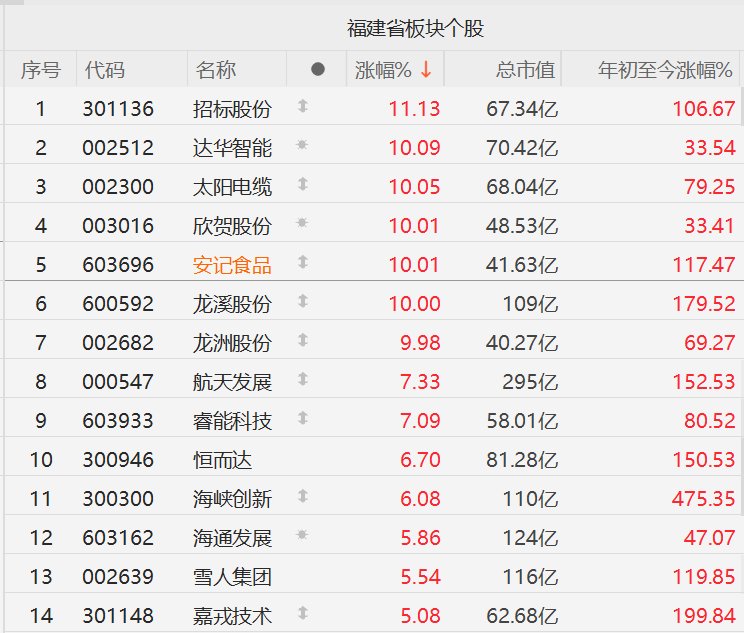 A股市场福建股再度集体活跃,其中,招标股份涨超11%,达华智能、太阳电缆(3连板)、欣贺股份(2连板)、安记食品(3连板)、龙溪股份、龙洲股份(2连板)10CM涨停,航天发展、睿能科技涨超7%,恒而达、海峡创新涨超6%,海通发展、雪人集团、嘉戎技术涨超5%。