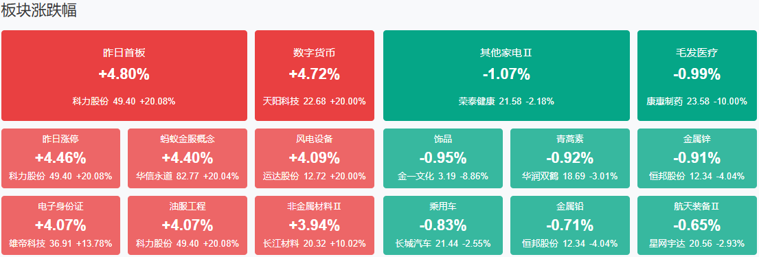 板块方面,数字货币、影视、CPO、石油等板块涨幅居前,贵金属、汽车整车、机场、航运等板块跌幅居前。截至收盘,沪指涨0.35%,深成指涨0.41%,创业板指涨0.66%。