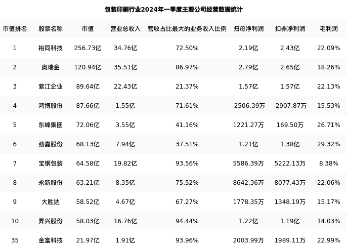 金富科技最新报告期数据为一季度,下表汇总了包装印刷行业内市值靠前的公司一季度主要经营数据