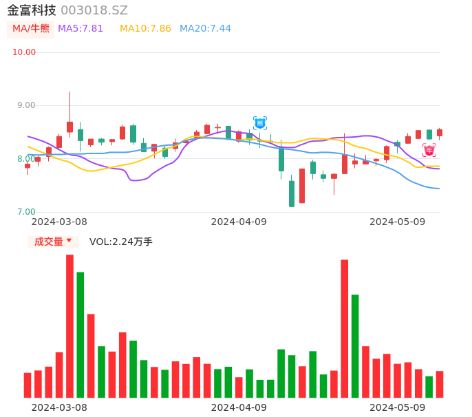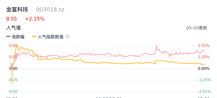 05月09日,金富科技收报8.55,股价涨幅2.15%,成交金额1901.53万元,换手率1.69%。