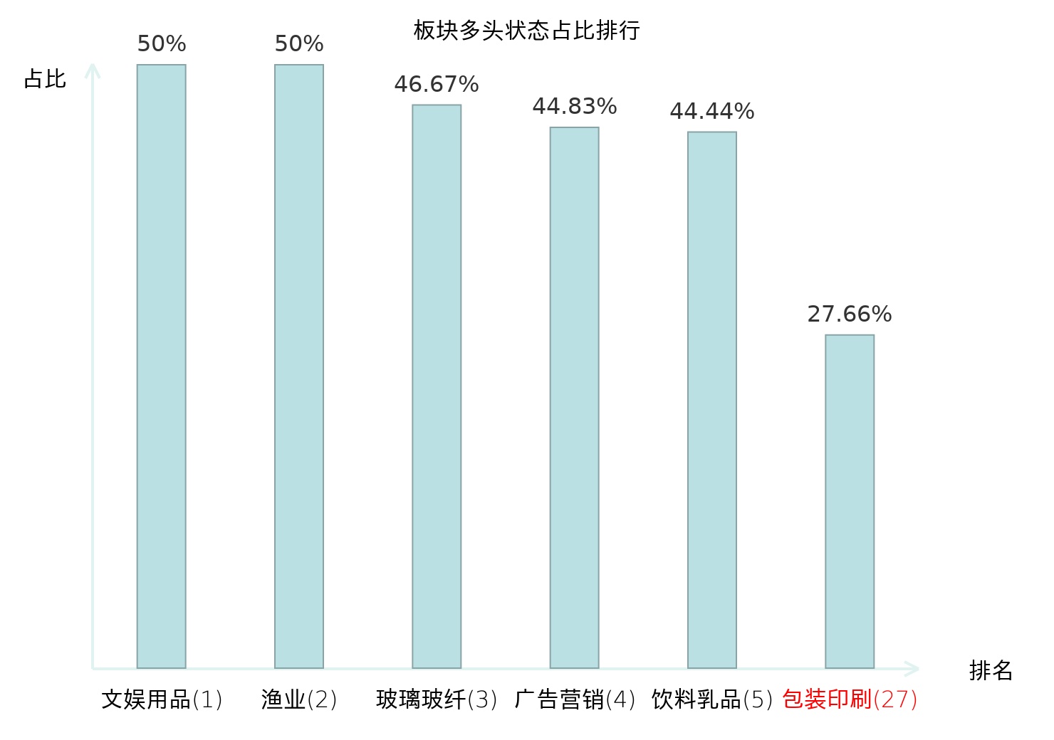 全市场所有行业板块中主力多头状态占比排名中,文娱用品板块位居第一。饮料乳品板块名次提升最快,较昨日上升59位。