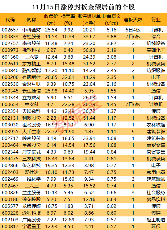 以封单金额计算,18股封单超1亿元,其中中科金财、粤桂股份、南兴股份封单金额居前,分别为5.16亿元、3.88亿元、3.82亿元。