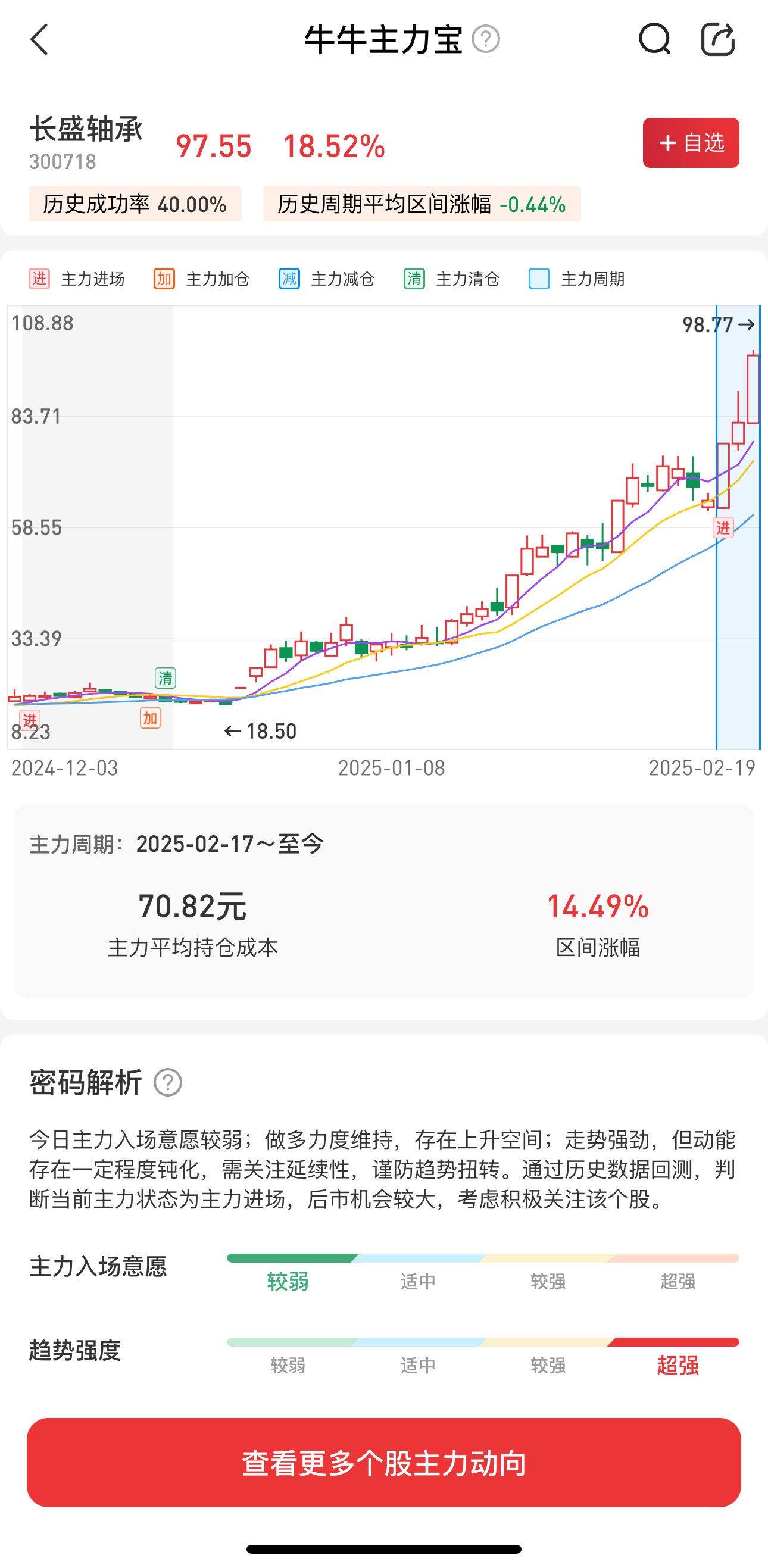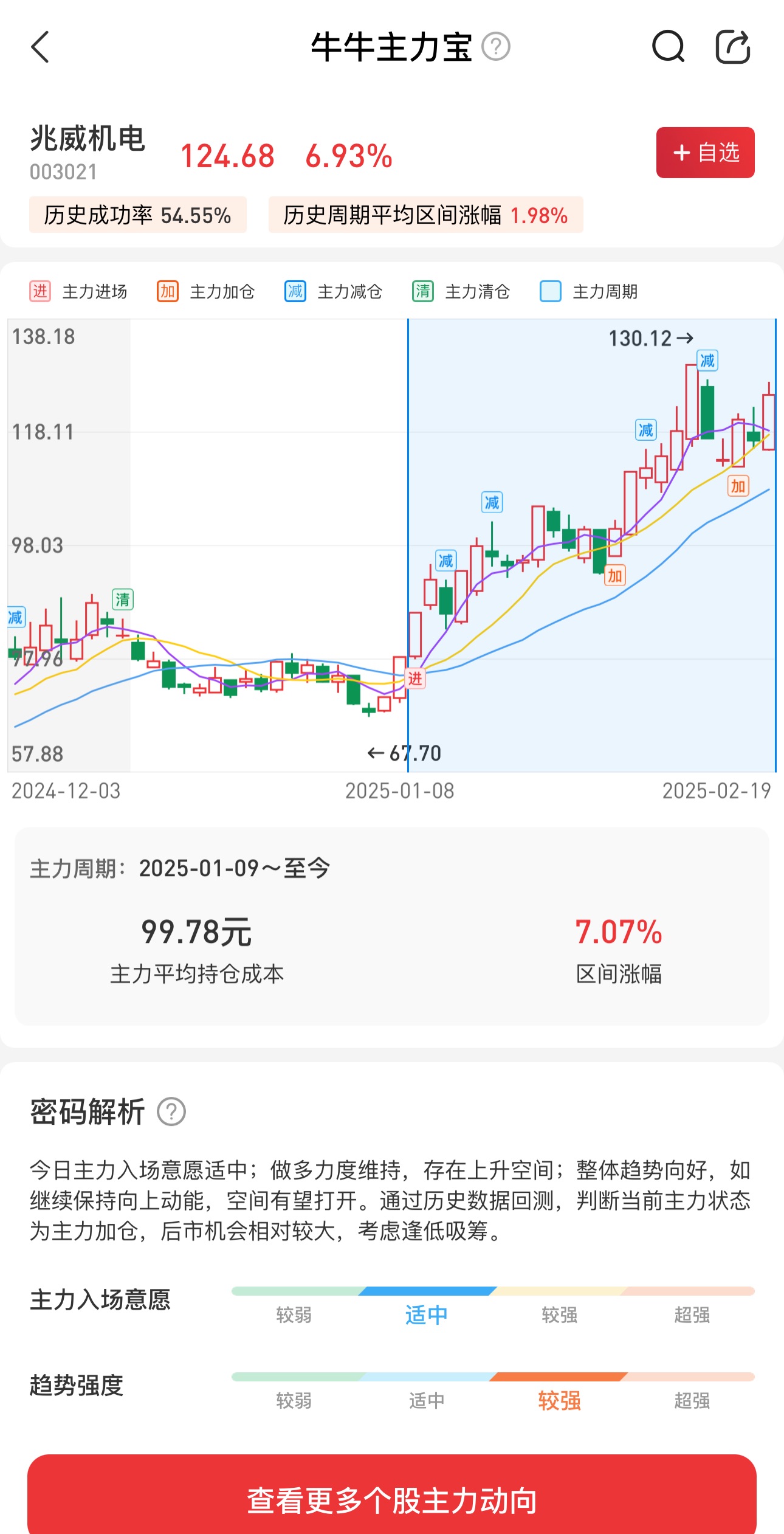 以机器人趋势股兆威机电为例,近期市场出现机器人板块反复活跃的走势,但是实际上通过机构宝的控盘力度就可以看出是否有趋势机会,先通过“搜索”找到个股,再看控盘力度是否一直活跃,针对自选股也能一键看到自选股动向: