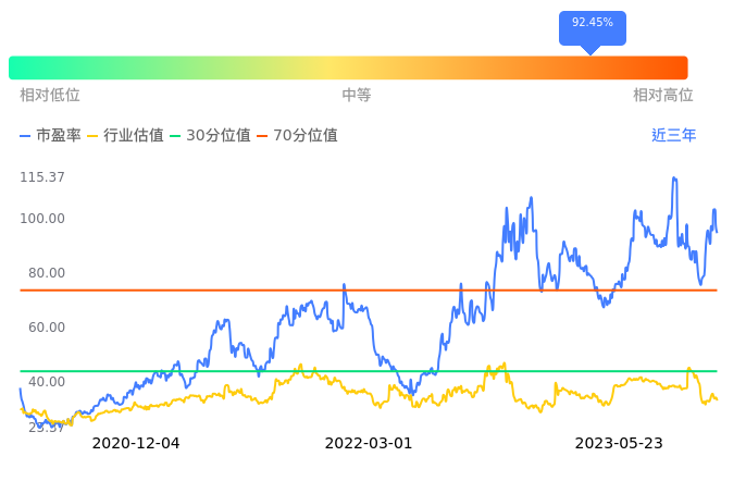 2023年05月23日,兆威机电下跌2.23%收于86.42,今日成交金额7.34亿元。下文将从市盈率PETTM、市净率PB、市现率3个角度去分析公司估值情况。