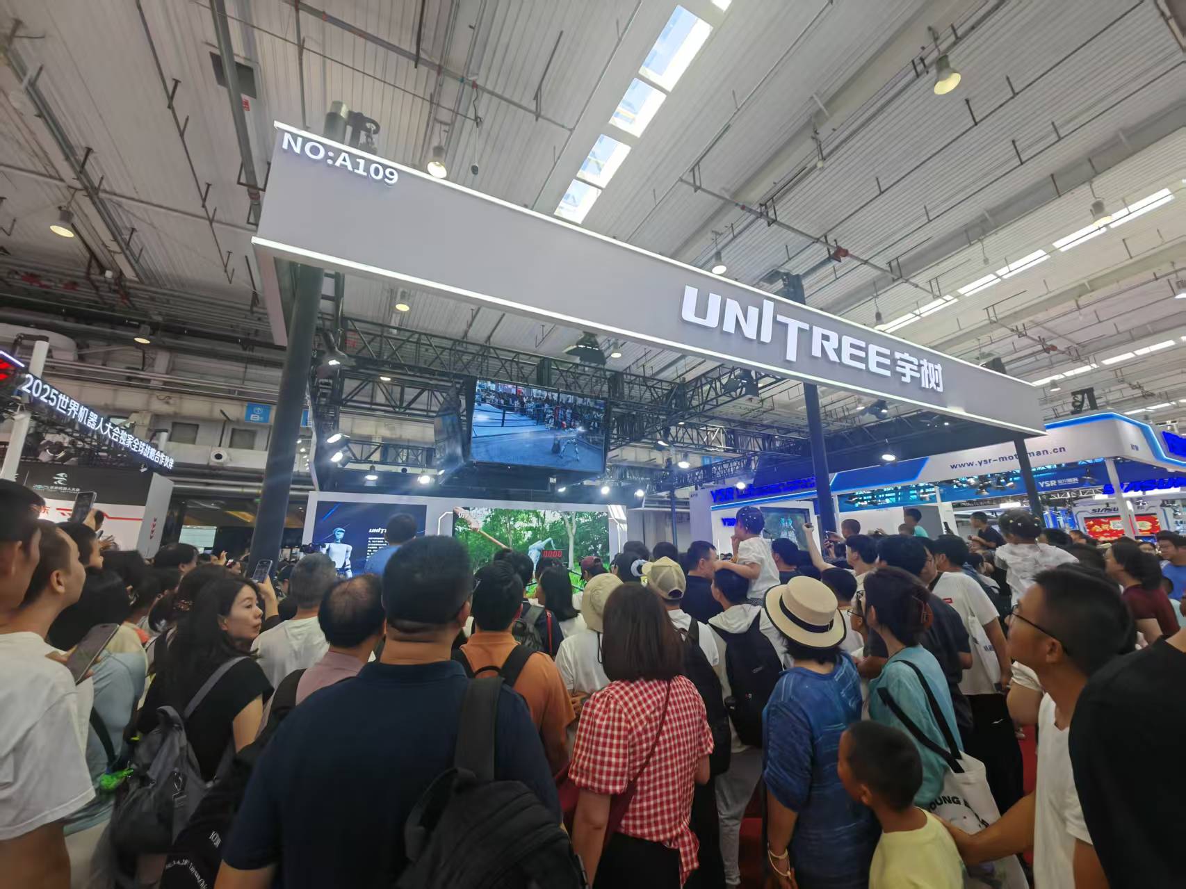 在宇树科技的展台,人群围得水泄不通,他们正在观看一场机器人格斗表演。