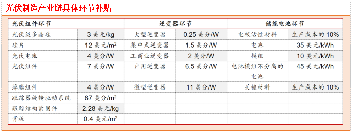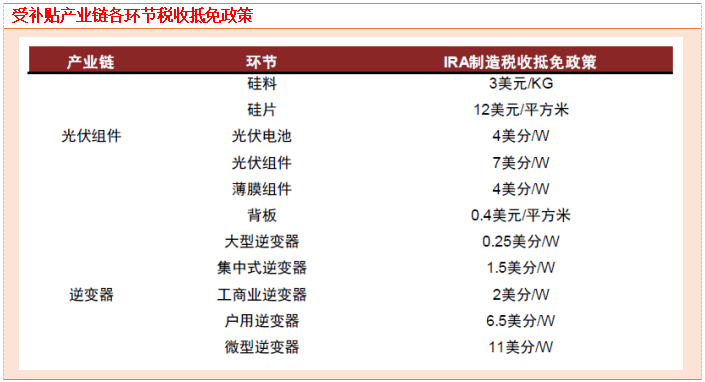 投资税收抵免主要用于建设清洁技术制造设施,例如制造电动汽车、太阳能电池板,光伏制造产业链补贴则主要涉及硅料、硅片、光伏电池、组件、薄膜组件和背板环节。此外,逆变器和储能电池产业链同样受到不同力度补贴。