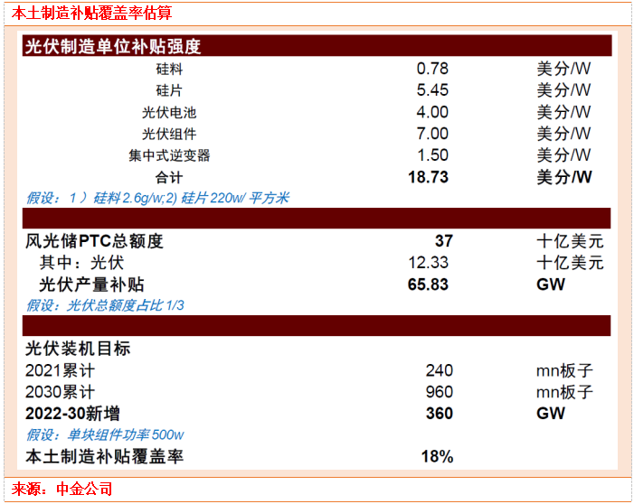 本次通胀削减法案给予美国风电、光伏、储能产能的本土制造税收补贴额度一共370亿美金,假设其中1/3用于支持光伏制造产能,基于法案中明确的硅料硅片电池组件逆变器单位补贴额度测算,对应可以支持约65GW的本土光伏制造产品产出(2022-2030),而基于拜登政府的目标,2022-2030年间美国需累计新增光伏装机约360GW。