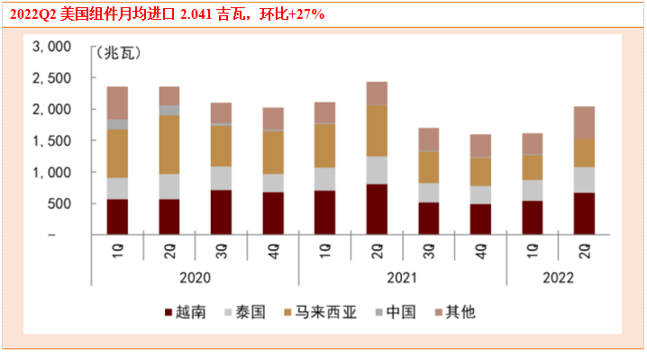 自今年2月海关暂扣的多家组件企业获得放行后,我们注意到2Q22对美组件发货量环比出现好转,美国组件的进口量在4、5月平均来看较一季度环比增长了27%。当前,需持续关注6月21日实施的UFLPA对于中国企业的组件产品输美通关是否带来额外扰动,预计出口企业有望于8-9月看到有关于如何满足UFLPA的更清晰、可执行的政策细节出台。