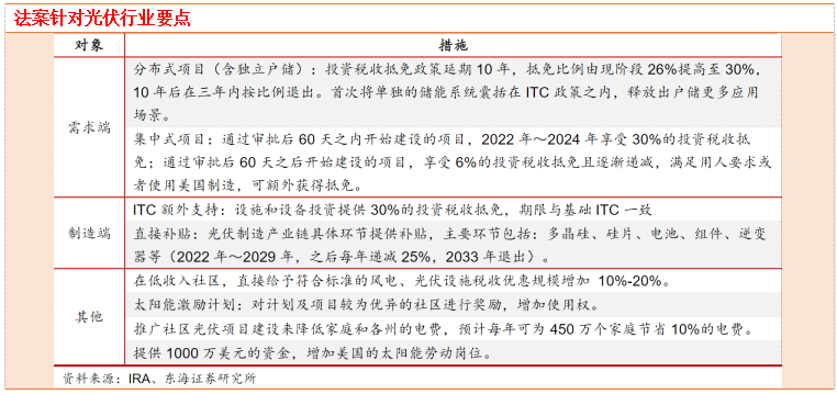 需求端主要通过提高税收抵免并延长期限。制造端通过ITC以及生产补贴。其他政策针对社区光伏、劳动岗位、低收入社区以及家庭和各州电费降低。