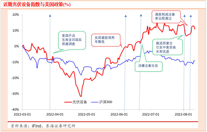 行业表现上,目前法案落地,短期兑现情绪较高。后续要继续关注此项法案能否对于光伏出口有实质性提振,以及未来中美光伏贸易关系,特别是针对东南亚产能的政策。