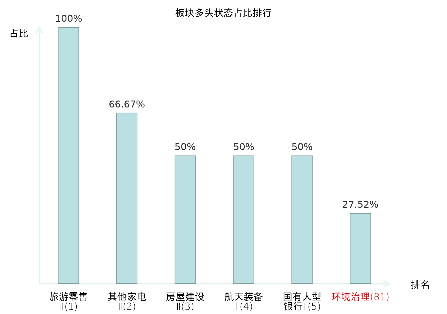 全市场所有行业板块中主力多头状态占比排名中,旅游零售Ⅱ板块位居第一。国有大型银行Ⅱ板块名次提升最快,较昨日上升112位。