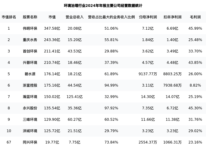 同兴环保最新报告期数据为年报,下表汇总了环境治理行业内市值靠前的公司年报主要经营数据