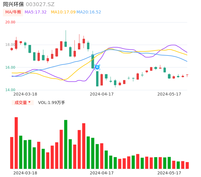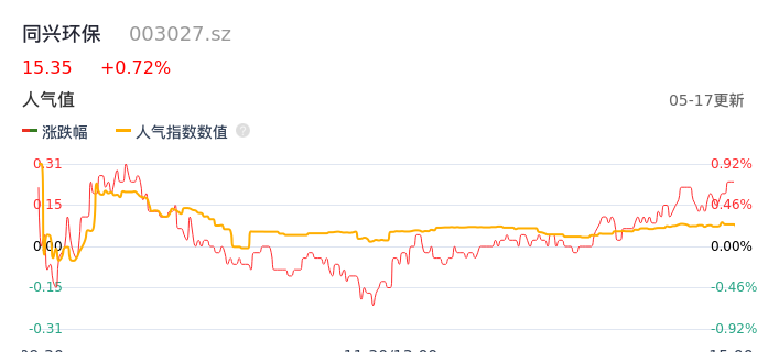 05月17日,同兴环保收报15.35,股价涨幅0.72%,成交金额3043.06万元,换手率2.96%。
