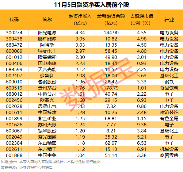 具体到个股,11月5日获融资净买入千万元以上的有460只,其中21只融资净买入额超1亿元。阳光电源融资净买入额居首,当日净买入4.34亿元;其次是鹏辉能源阿特斯,融资净买入金额分别为3.05亿元、3.03亿元,融资净买入金额居前的还有特变电工隆基绿能国电南瑞等。