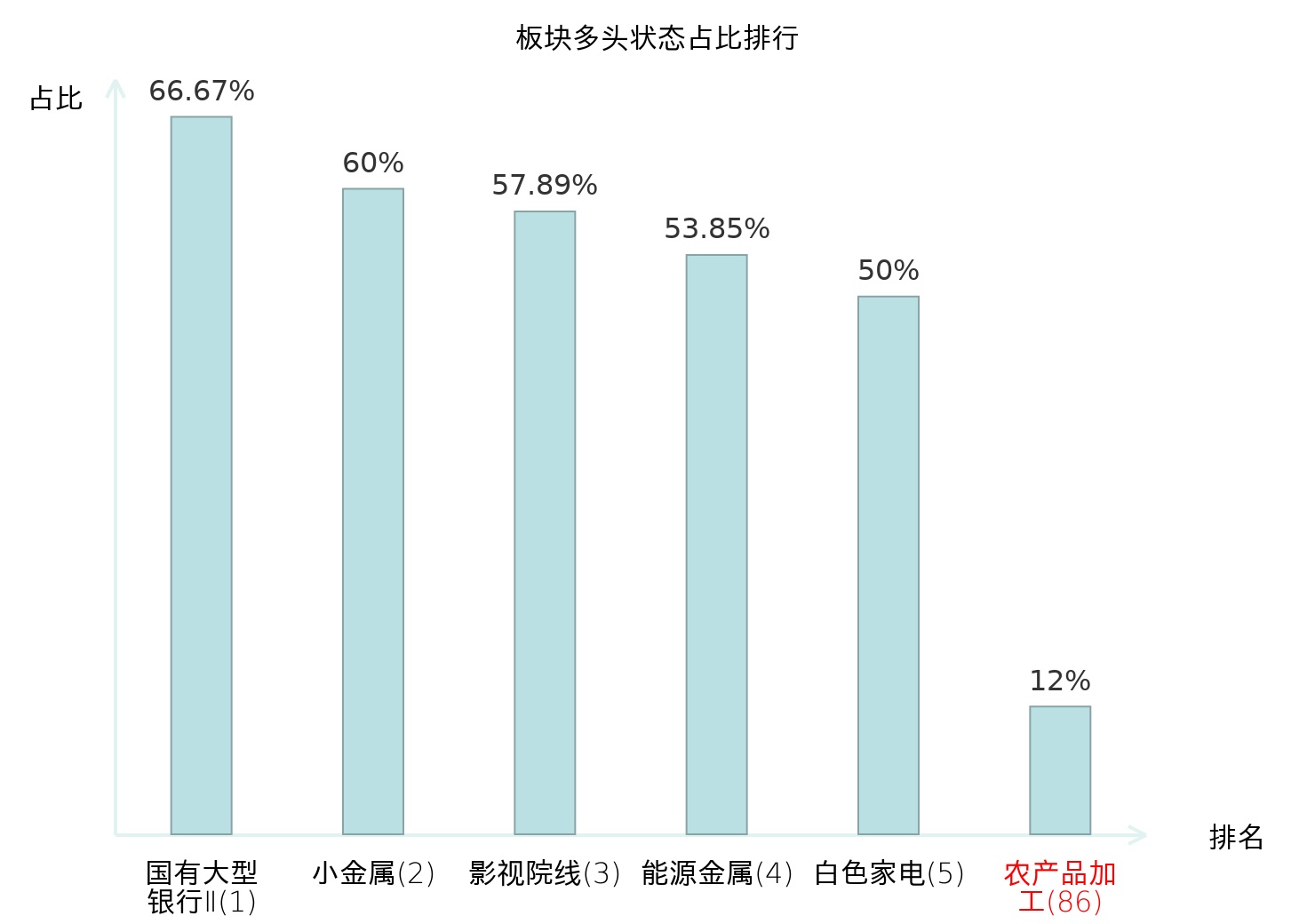全市场所有行业板块中主力多头状态占比排名中,国有大型银行Ⅱ板块位居第一。装修装饰Ⅱ板块名次提升最快,较昨日上升48位。