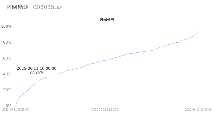 003035南网能源2025年06月11日成交39.14万手,成交金额1.92亿,相较昨日缩量24.16万手,换手率1.03%,成交清淡。