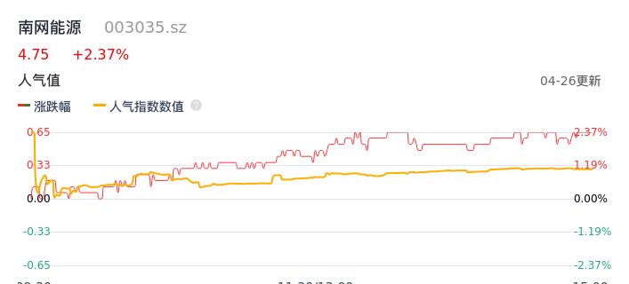 04月26日,南网能源收报4.75,股价涨幅2.37%,成交金额6953.23万元,换手率0.65%。