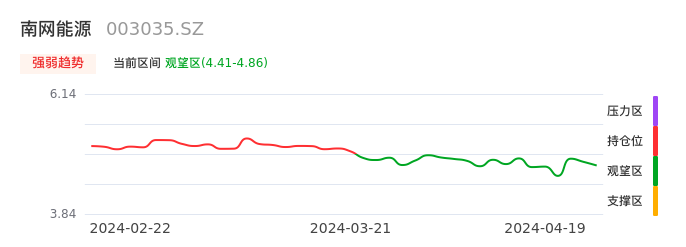 我们来看一下该股的九方特色指标强弱趋势的情况:南网能源自03月22日从持仓区下穿到观望区,股价近期持续走弱。短期已经进入空头行情,且下跌动能仍未衰竭。建议继续谨慎观望。