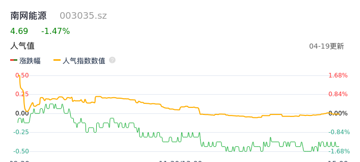 04月19日,南网能源收报4.69,股价涨幅-1.47%,成交金额4182.30万元,换手率0.39%。