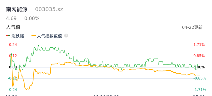 04月22日,南网能源收报4.69,股价涨幅0.00%,成交金额4206.32万元,换手率0.40%。