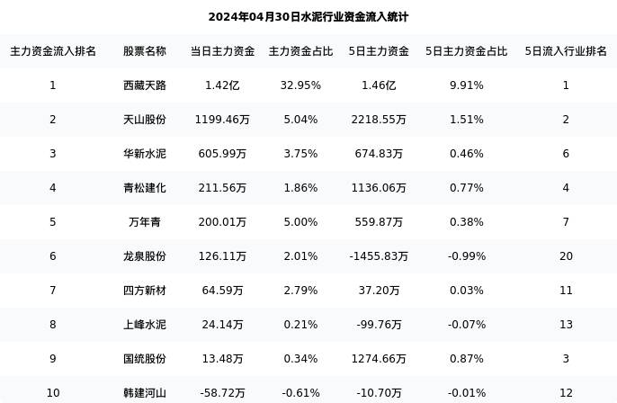 从主力资金流向来看,水泥行业今日主力资金流入7.18亿元,在所有申万二级行业中排名:72/131。