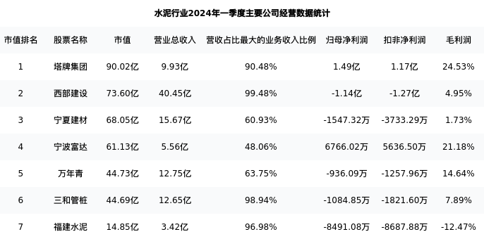 三和管桩最新报告期数据为一季度,下表汇总了水泥行业内市值靠前的公司一季度主要经营数据