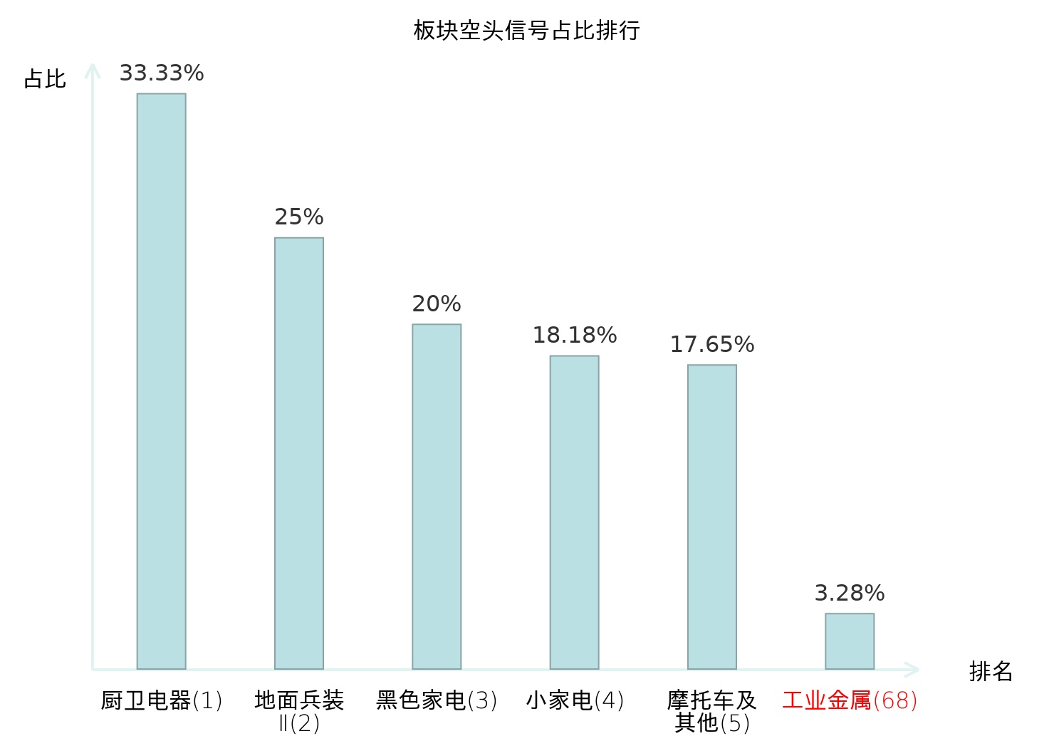 全市场所有行业板块中主力空头信号占比排名中,厨卫电器板块位居第一。服装家纺板块名次提升最快,较昨日上升124位。