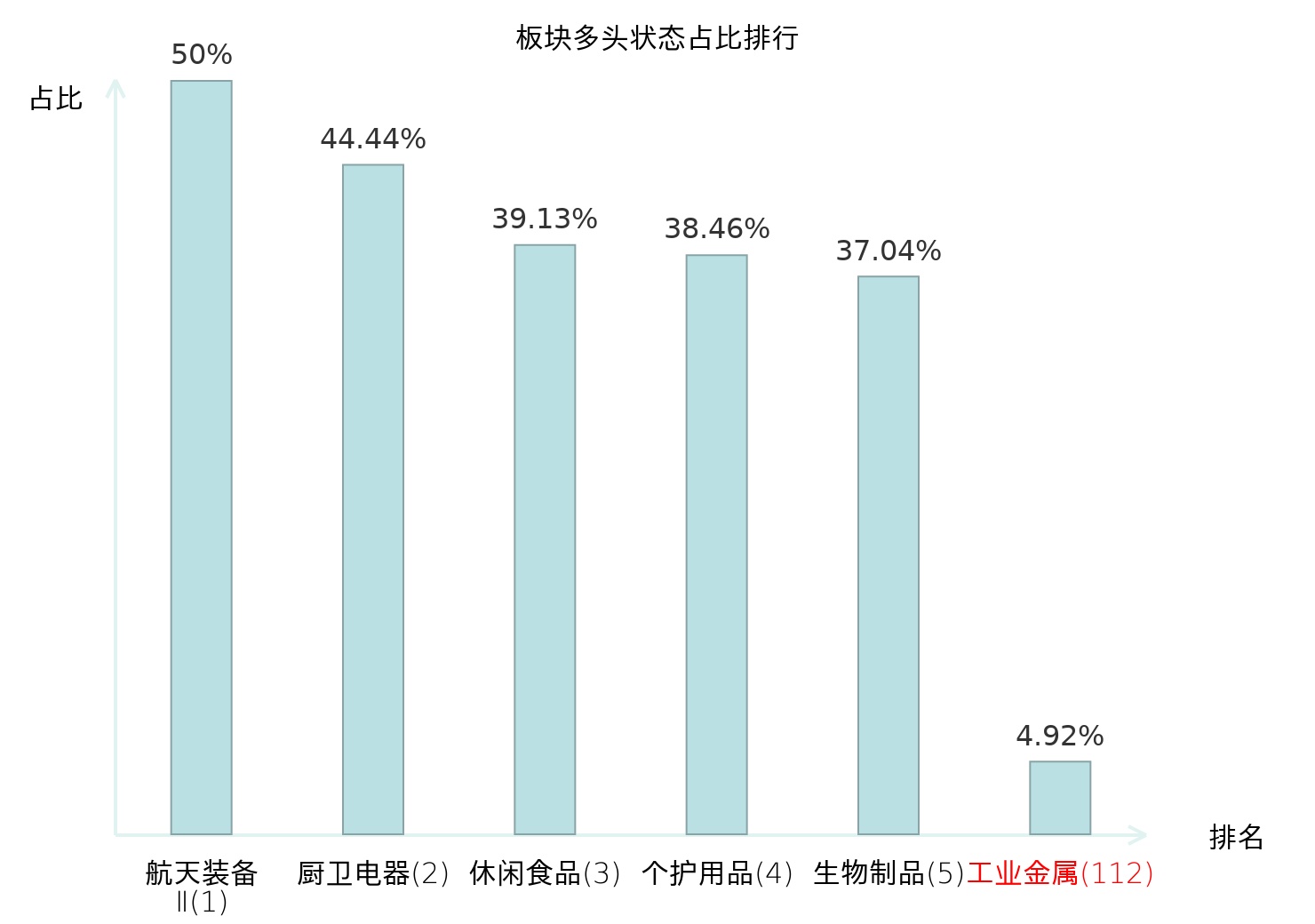 全市场所有行业板块中主力多头状态占比排名中,航天装备Ⅱ板块位居第一。小金属板块名次提升最快,较昨日上升53位。