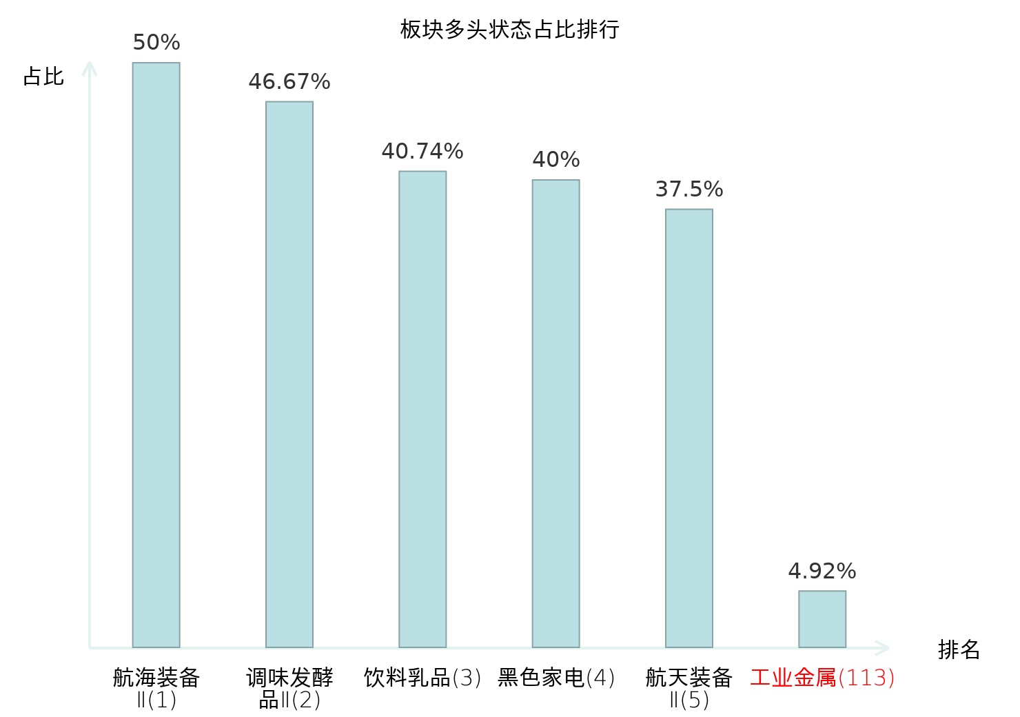 全市场所有行业板块中主力多头状态占比排名中,航海装备Ⅱ板块位居第一。航海装备Ⅱ板块名次提升最快,较昨日上升99位。