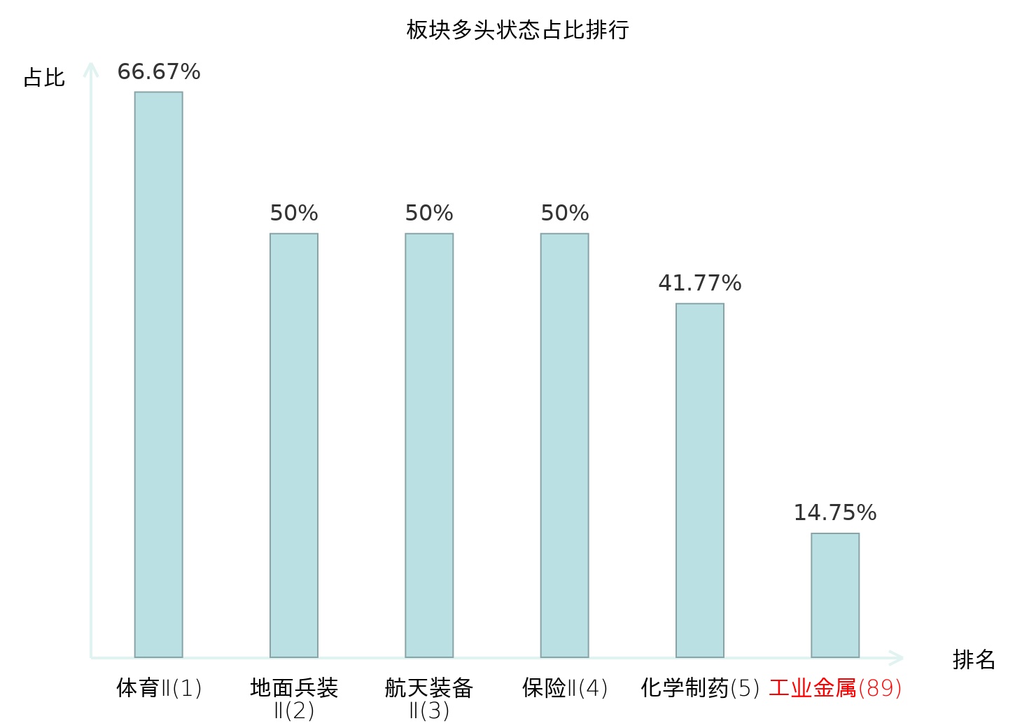 全市场所有行业板块中主力多头状态占比排名中,体育Ⅱ板块位居第一。普钢板块名次提升最快,较昨日上升98位。