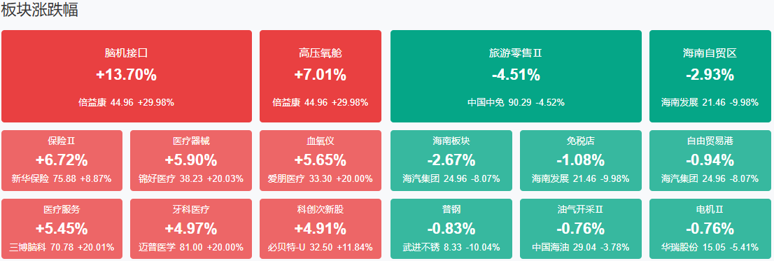 板块题材上,脑机接口、保险、存储芯片等板块涨幅居前;海南自贸区、旅游及酒店、钢铁、油气开采等板块表现落后。截至收盘,沪指涨1.38%,深成指涨2.24%,创业板指涨2.85%。