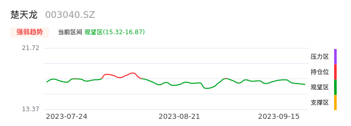 我们来看一下该股的九方特色指标强弱趋势的情况:楚天龙自08月14日从持仓区下穿到观望区,股价近期持续走弱。短期已经进入空头行情,且下跌动能仍未衰竭。建议继续谨慎观望。