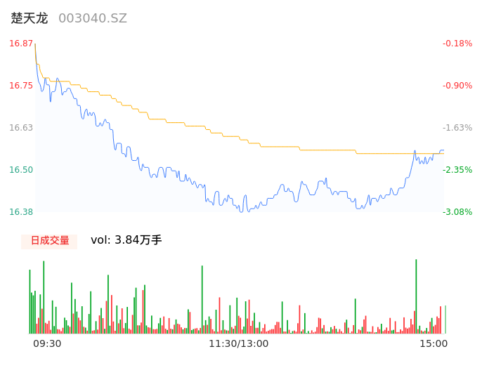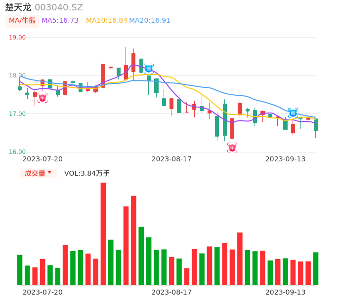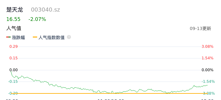 09月13日,楚天龙收报16.55,股价涨幅-2.07%,成交金额6360.88万元,换手率1.78%。