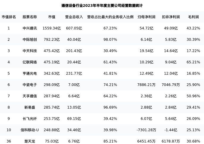 楚天龙最新报告期数据为半年度,下表汇总了通信设备行业内市值靠前的公司半年度主要经营数据
