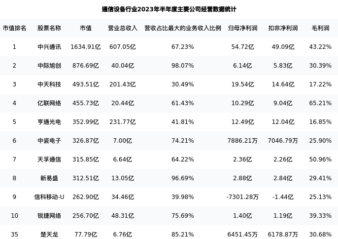 楚天龙最新报告期数据为半年度,下表汇总了通信设备行业内市值靠前的公司半年度主要经营数据