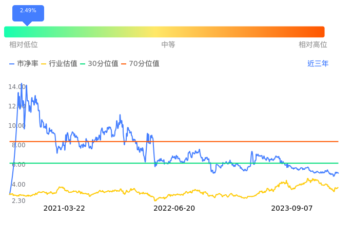 楚天龙当前市净率PB为5.14,在所属的通信设备中,市净率PB排59,前五名分别为亨通光电市净率1.43、高鸿股份市净率1.48、中天科技市净率1.53、*ST新海市净率1.59、辉煌科技市净率1.62。楚天龙当前市净率PB为5.14,超过近3年2.49%的历史数据。