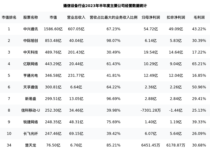楚天龙最新报告期数据为半年度,下表汇总了通信设备行业内市值靠前的公司半年度主要经营数据
