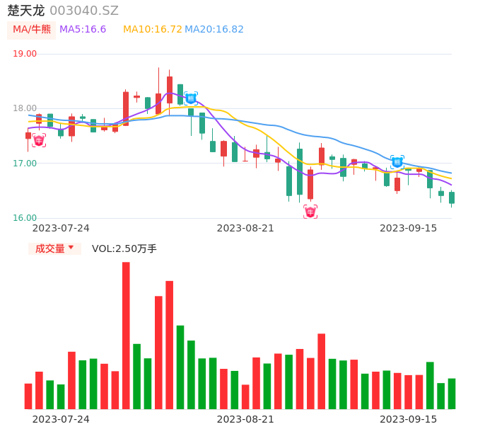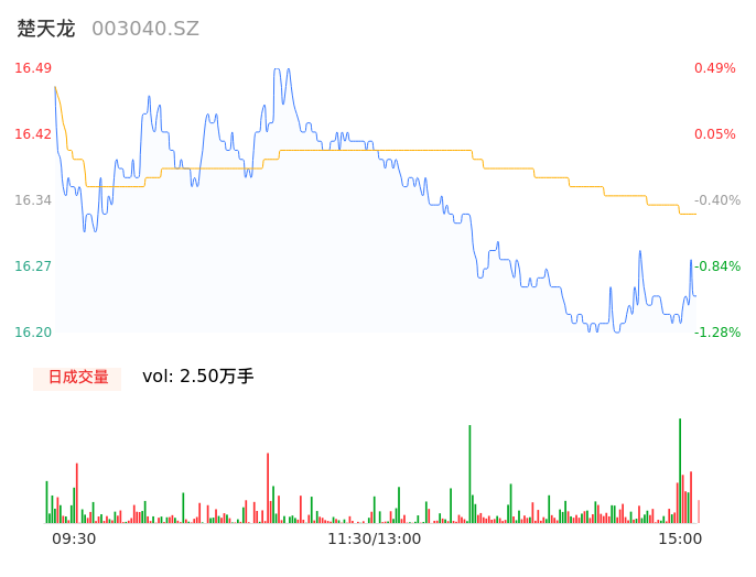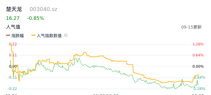 09月15日,楚天龙收报16.27,股价涨幅-0.85%,成交金额4086.44万元,换手率1.16%。