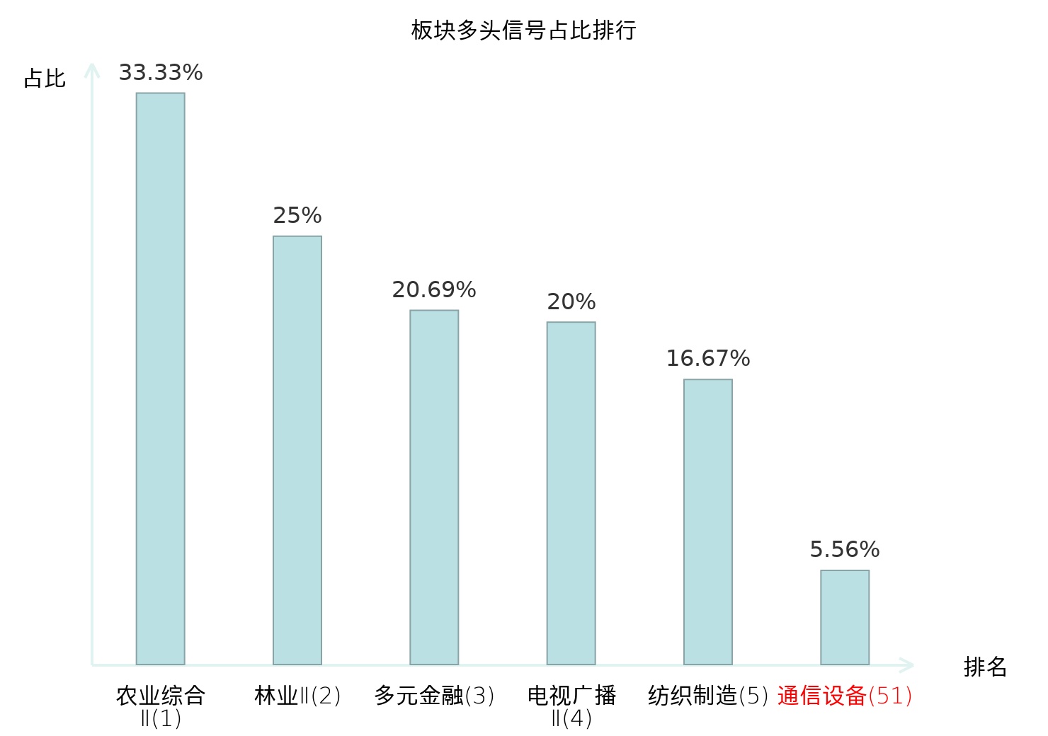全市场所有行业板块中主力多头信号占比排名中,农业综合Ⅱ板块位居第一。农业综合Ⅱ板块名次提升最快,较昨日上升127位。