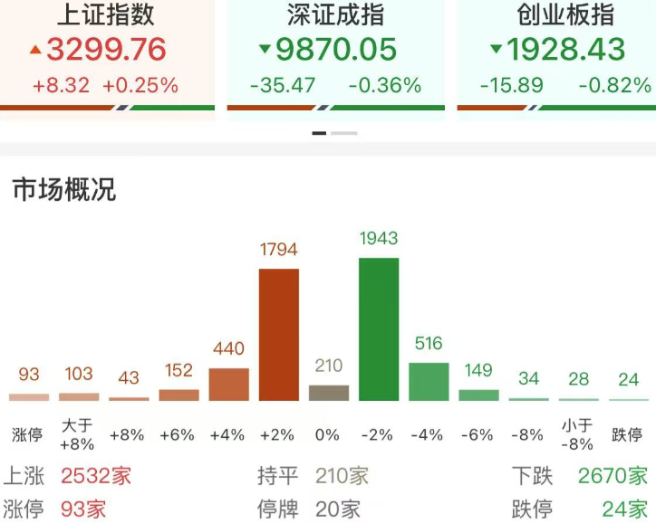 市场全天震荡分化,三大指数涨跌不一,沪指一度站上3300点。沪深两市全天成交额1.09万亿,较上个交易日放量486亿。盘面上,物流、统一大市场概念股集体走强,华鹏飞等多股涨停。跨境支付概念股、农药、化肥概念股表现活跃。算力概念股展开调整,光环新网跌超5%。截至收盘,沪指涨0.25%,深成指跌0.36%,创业板指跌0.82%。涨跌幅方面,物流、跨境支付、农药、农业等板块涨幅居前,机器人、算力、液冷服务器、旅游等板块跌幅居前。