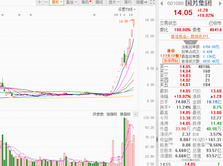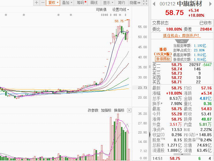 市场情绪:银行助攻沪指盘中冲破3300,成交量温和释放,情绪持续回暖;市场热点快速轮动,个股上涨和下跌家数基本相当。今日共81股涨停,连板股总数23只,21股封板未遂,封板率为79%(不含ST股、退市股)。高位股持续受资金追捧,国芳集团13天12板,中旗新材15天9板,连云港13天8板,红宝丽13天7板,乐山电力11天7板,安记食品6连板。