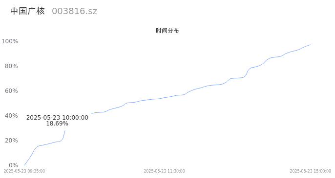 003816中国广核2025年05月23日成交114.42万手,成交金额4.20亿,相较昨日放量19.40万手,换手率0.29%,成交清淡。
