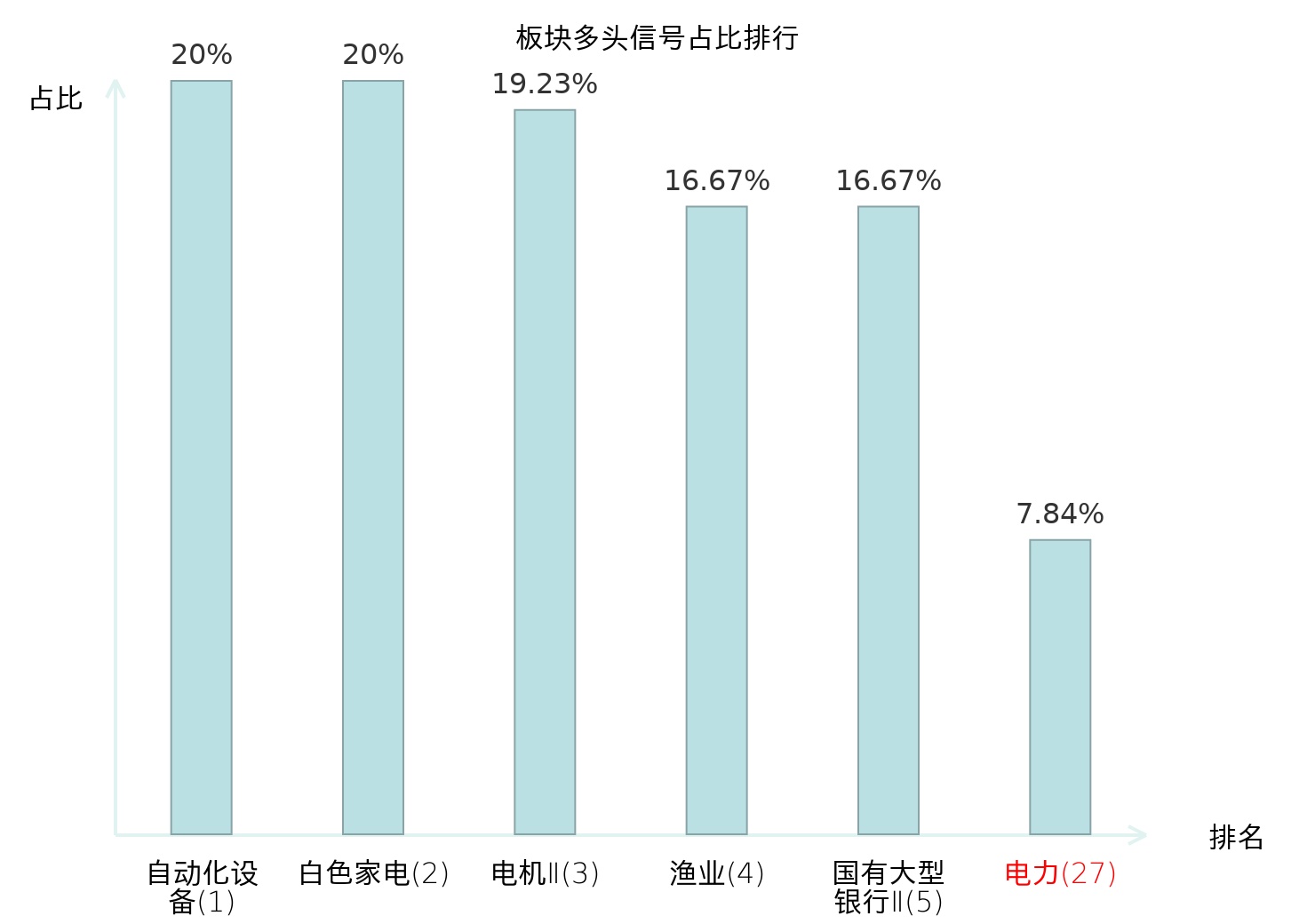 全市场所有行业板块中主力多头信号占比排名中,自动化设备板块位居第一。渔业板块名次提升最快,较昨日上升118位。