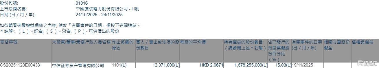 格隆汇11月24日丨根据联交所最新权益披露资料显示,2025年11月19日,中广核电力(01816.HK)获中信证券资产管理有限公司在场内以每股均价2.9671港元增持1237.1万股,涉资约3670.6万港元。